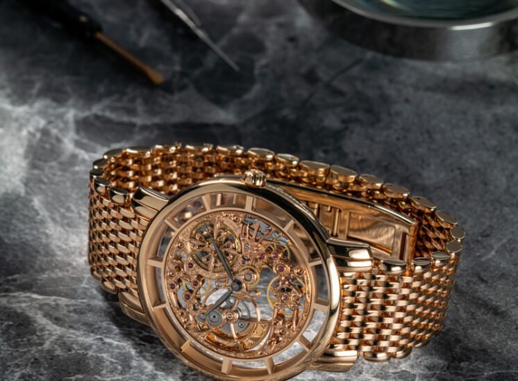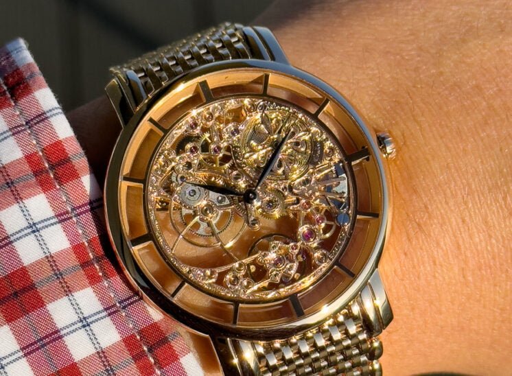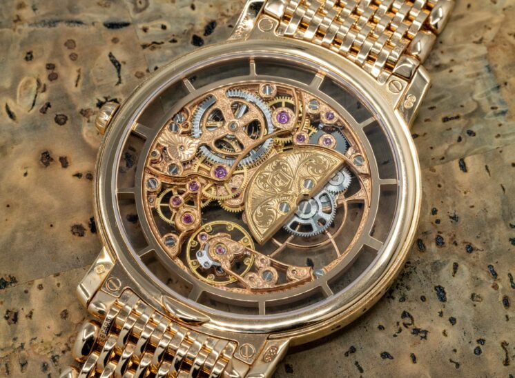 Movement entirely skeletonized, decorated, and engraved by hand.