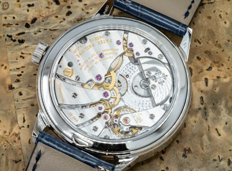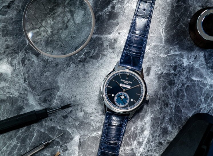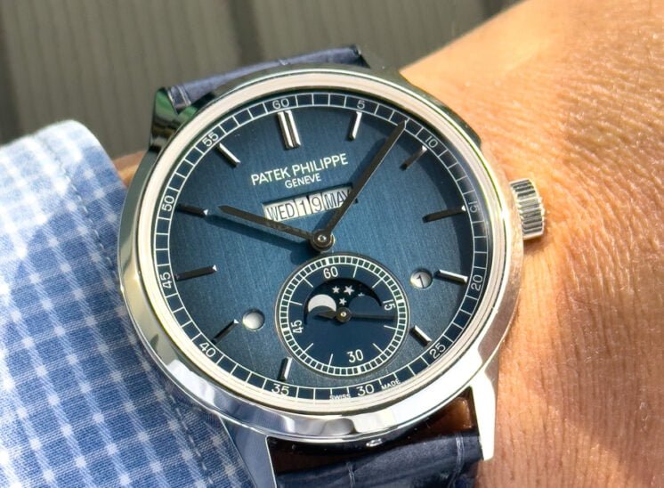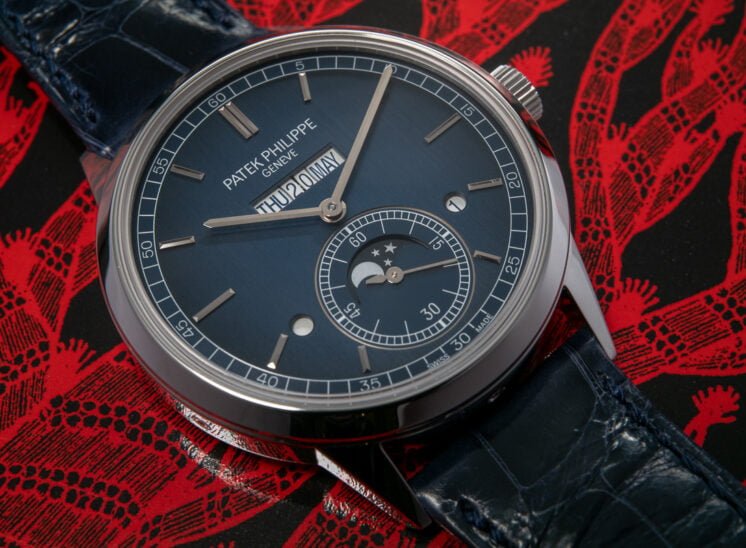 In-line Perpetual Calendar. Day, date, month, leap year and day/night indication in apertures. Small seconds. Moon phases..