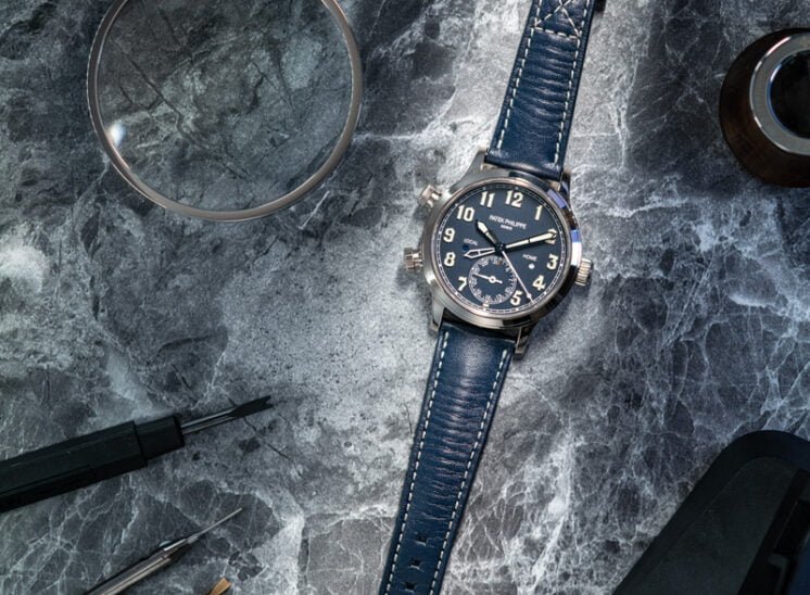 Shiny Navy Blue and Vintage Brown Calf leather strap.